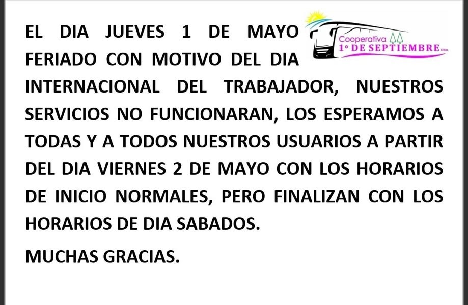Con motivo de celebrarse el dia internacional del trabajador , la empresa no brindara el servicio y se normalizara el dia vieres 2